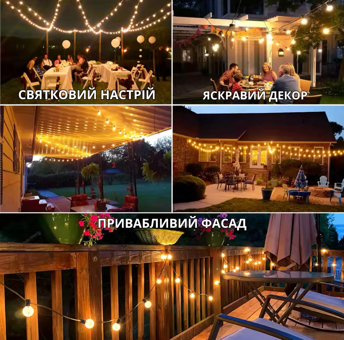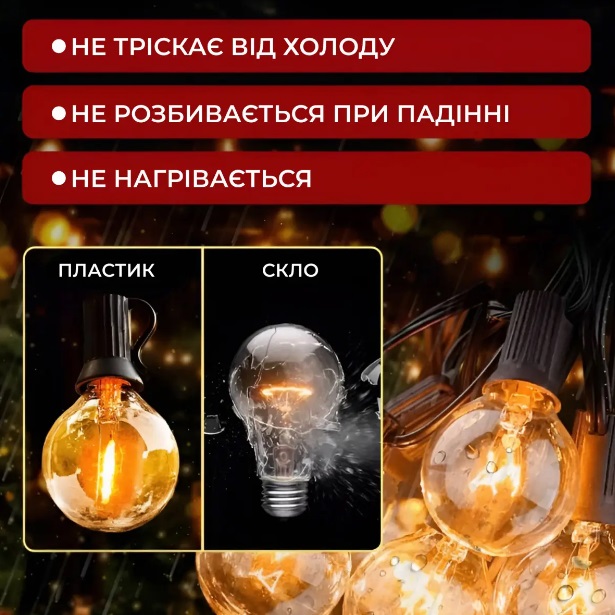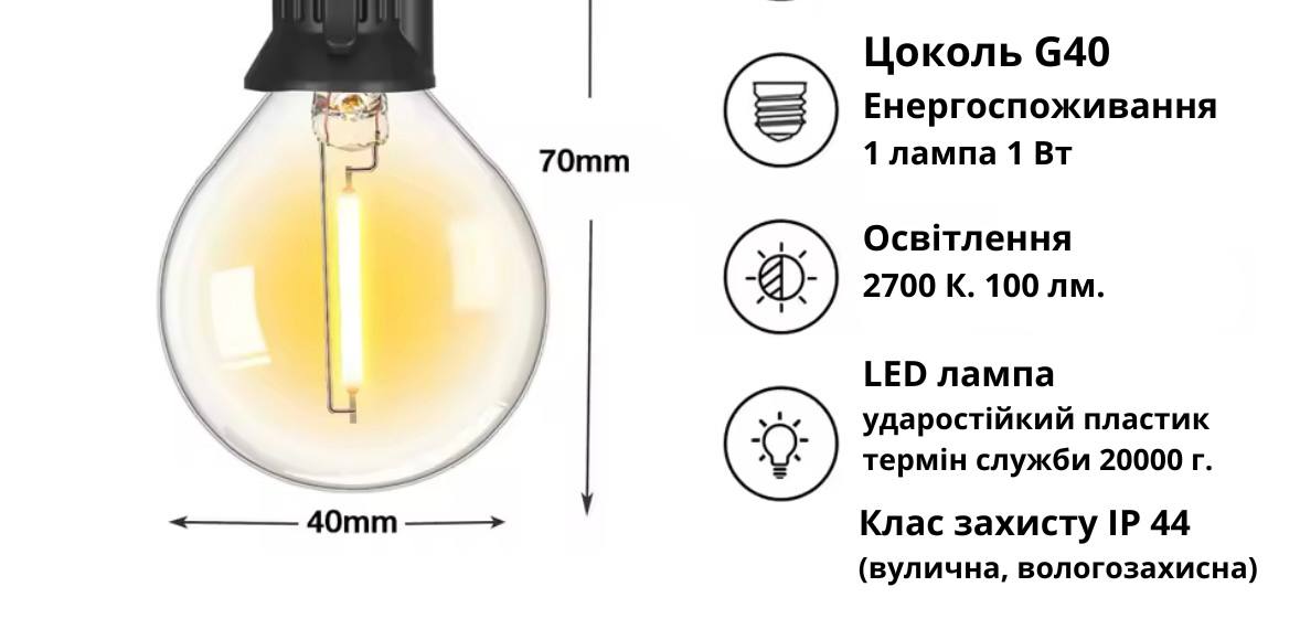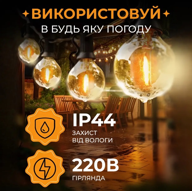 Вулична ретро гірлянда стане чудовим доповненням вашого саду чи будинку, створюючи теплу і затишну атмосферу. Її дизайн дозволяє прикрашати альтанки, веранди, дерева та чагарники, а також використовувати в екстер'єрі кафе та ресторанів. Гірлянда може стати стильним елементом інтер'єру або додатковим освітленням у приміщеннях.
